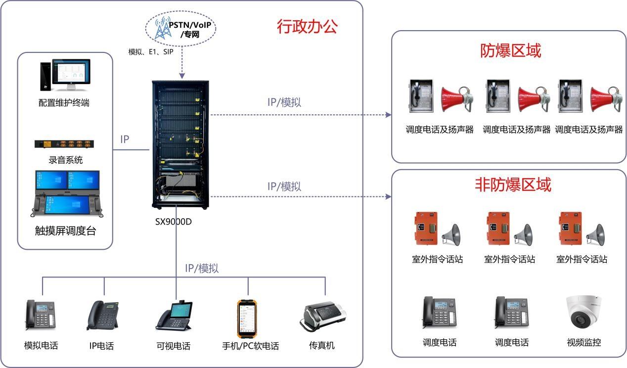 SX9000D多媒體調度通信系統(tǒng) 是新一代、技術高度融合的多媒體調度系統(tǒng),提供豐富的接口接入(E1、VOIP、EM、FXO、IPS、FXS、磁石、廣播、對講、無源干報),單機滿足64個調度臺接入、64組電話會議和256路同時發(fā)言。SX9000D配合調度臺,可實現一鍵強插、強拆、組呼、群呼、轉接、選擇接入、一鍵回撥、緊急電話、報警通知、通訊錄查詢、夜服等系列功能,可滿足行業(yè)用戶在各種場景下的調度通信需求。